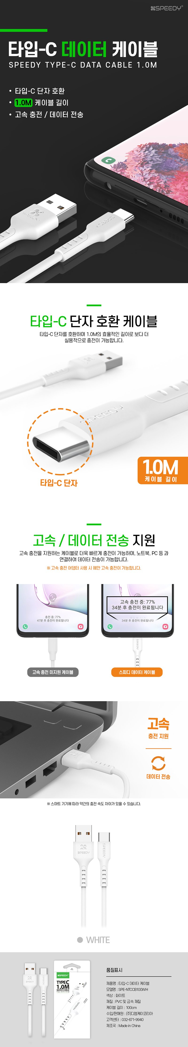 - HOME > 충전기/블루투스/이어폰 > 충전기 케이블 > 스피디 C타입 데이터 충전 케이블 1M